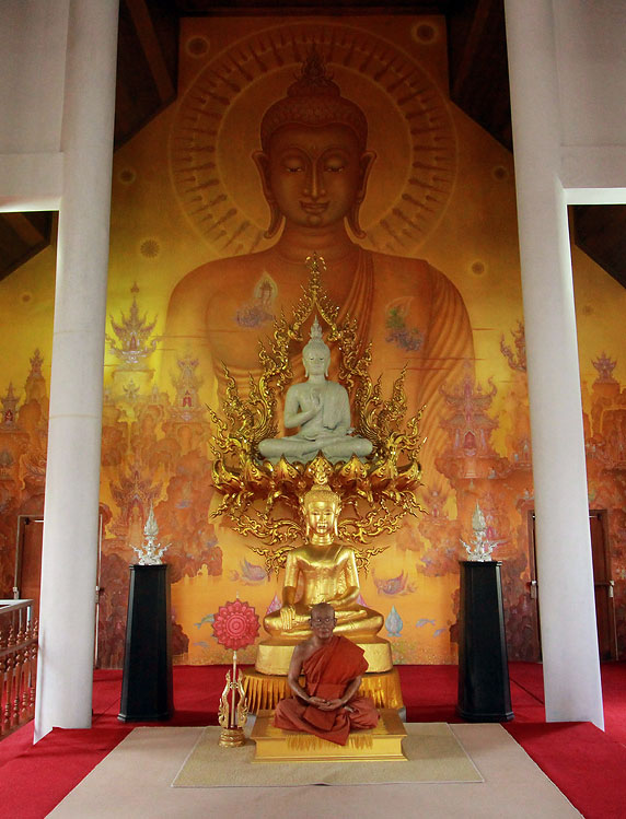 Но первое, что шокирует входящих в храм Wat Rong Khun – это неподвижная фигура монаха, сидящего под огромной статуей Будды. Он кажется застывшей куклой. А при ближайшем рассмотрении действительно оказывается отлично сделанным муляжом. Впрочем, кое-кто утверждает, что монах – настоящий, но просто мёртв и хорошо забальзамирован. Эта легенда напускает ещё больше ужаса в воображение туристов.