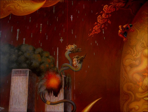 При этом художник использует не иллюстрацию жития святых и богов, а персонажей из фильмов, комиксов, или же – реальные трагические события, как, например, разрушение башен-близнецов 11 сентября.