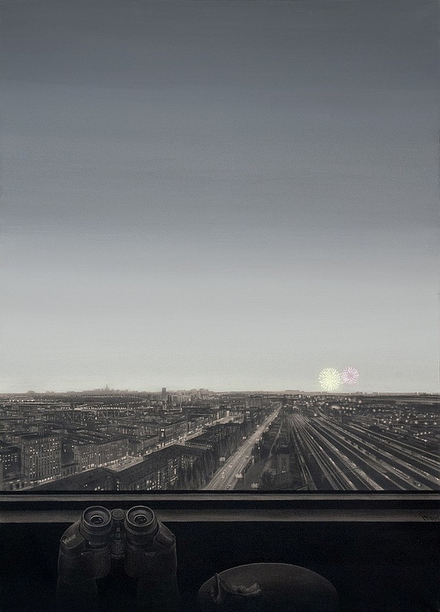 «Салют» - центральная работа данного проекта, отражающего две противоположности в череде дней, месяцев, лет жизни человека. Это праздники и будни. В этой работе Анастасия применила свой искуснейший композиционный прием, создающий ощущение бескрайности пространства, заполняющего большую часть холста. Картина безлюдна, только в ее низу в черноте ночи на передней линии крупным планом просматривается подоконник с биноклем и огрызком яблока на тарелке. Вдалеке на линии горизонта видны вспышки салюта, там праздник, сквозь дымку дальности горит огнями город, мелко изображенный внизу. Анастасии скупо использует цвет, однако тональная градация серовато-голубоватого позволяет ей придать множество нюансов и смыслов сюжету. Увы, праздник далек от обыденности, будней жизни владельцев подоконника.